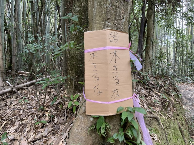 ところどころ「木きるな」と書かれた木が。なんか怖い。