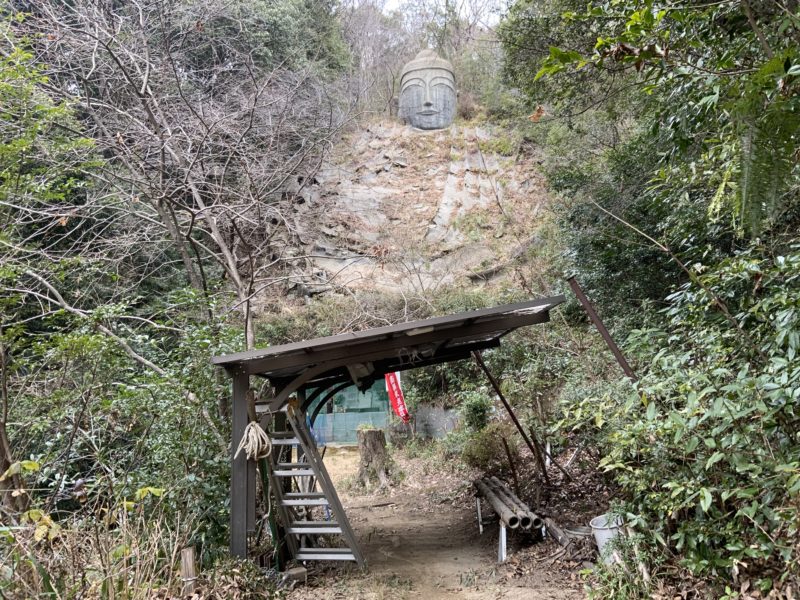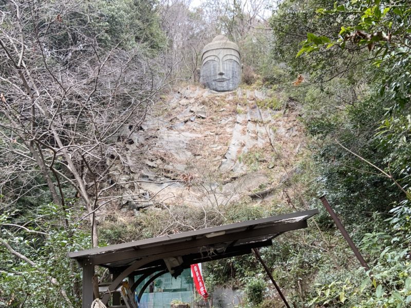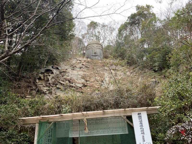 山道を進み、石仏群を抜け先に登っていた先で、巨大な「大釈迦坐像」と遭遇しました。山肌を身体に見立て、とても大きなその姿。