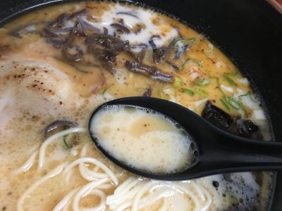 スープを啜ってみると、やや塩味が高めで、ニンニク風味は控えめな方。あっさり系でも後味に良いコクが残る理想的な味わい。ネギ、のり、キクラゲと安定したトッピング。