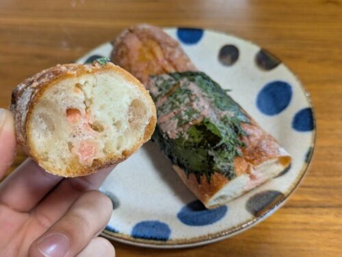 特性の自家製めんたいクリームが端までたっぷりで、トッピングして焼きこまれた大葉がベストマッチでした。