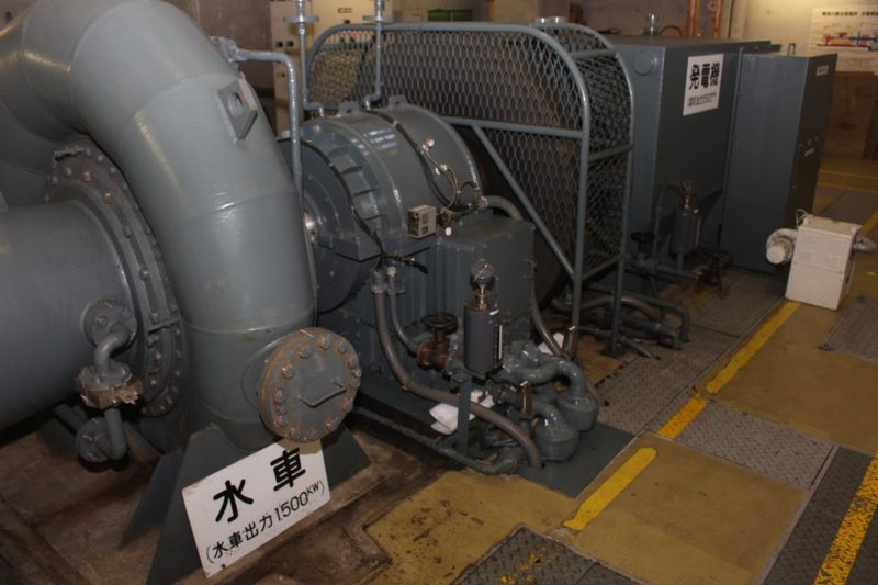 ここでも、先程の鉄管から運ばれてきた水が水車を回して発電しています。