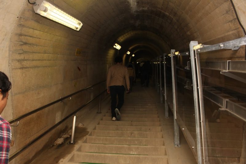 果てしない階段を上がり下がりしながら、壁内部を進んでいきます。正直しんどいです。保守点検用の通路とか行ってましたけど、この階段をひたすら行き来して保守とか苦行じゃないっすか…。先見えないんですけど、本当。みんな無言ですよ。