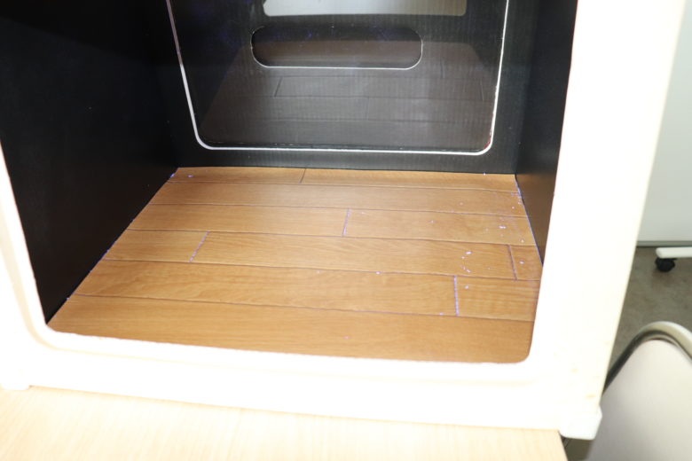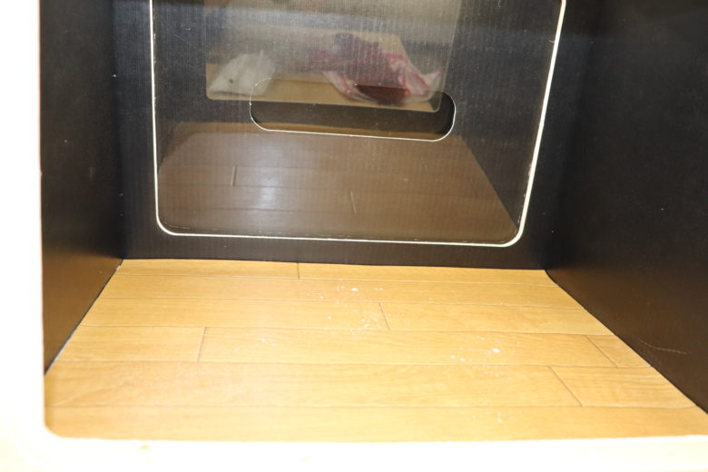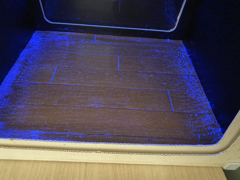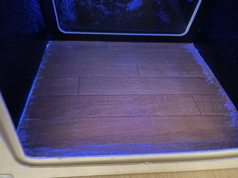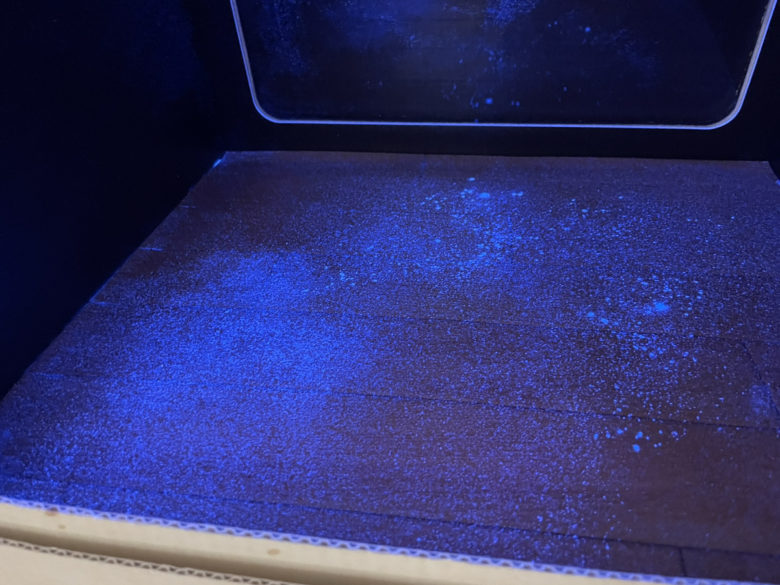 フローリングの床全体に蛍光塗料がついたホコリを撒きました。ちょっと塊になっちゃったのは見えるものの、その他は蛍光灯の下では目視できません。
