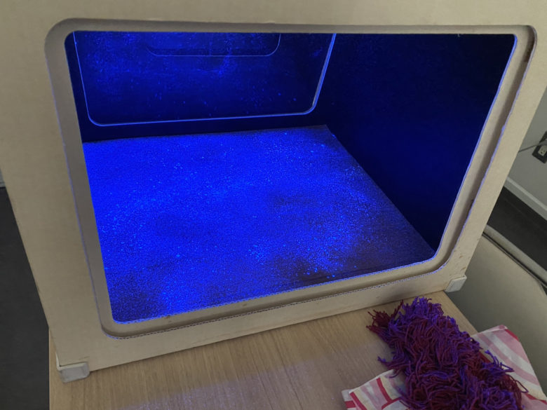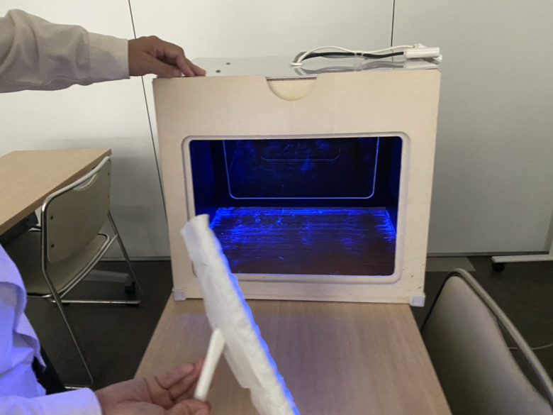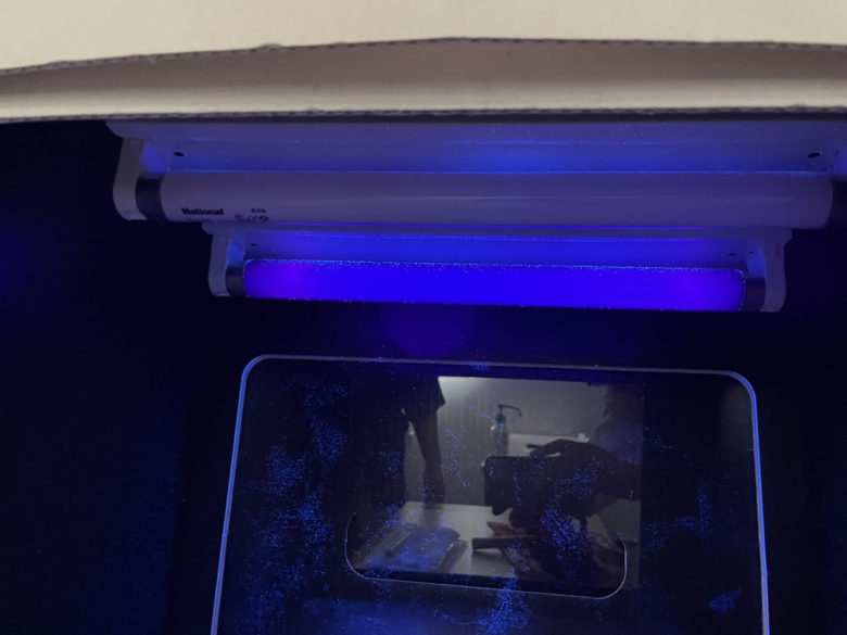 「はい、それでは持ち上げてブラックライトをつけて、この衝撃でどんだけホコリが舞うのかを見てみましょう」