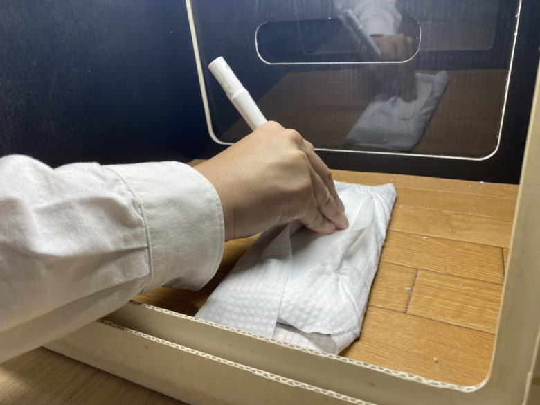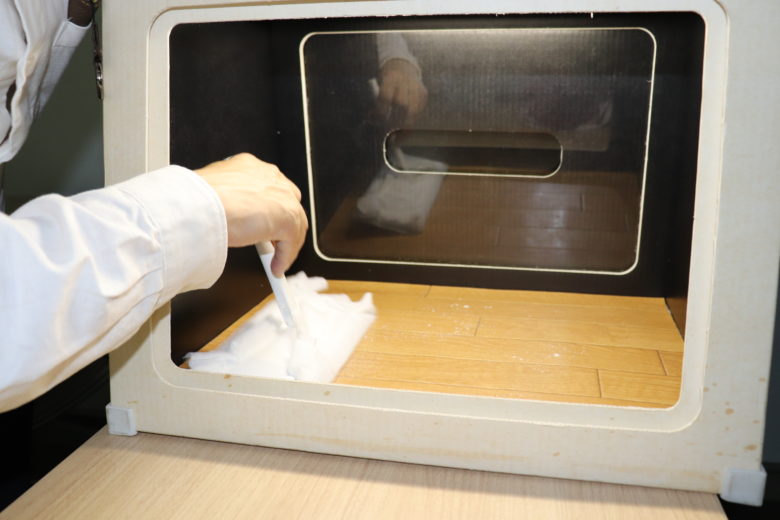 「ではホコリがあるこの状態でお掃除をしていきましょう。まずは市販のドライシートから。疑われたらアレなんで伊藤さんしてもらえますか?」