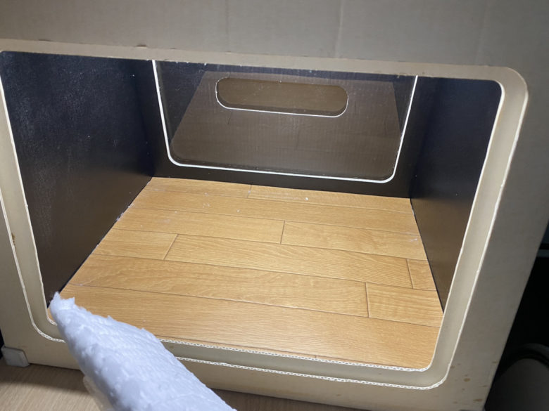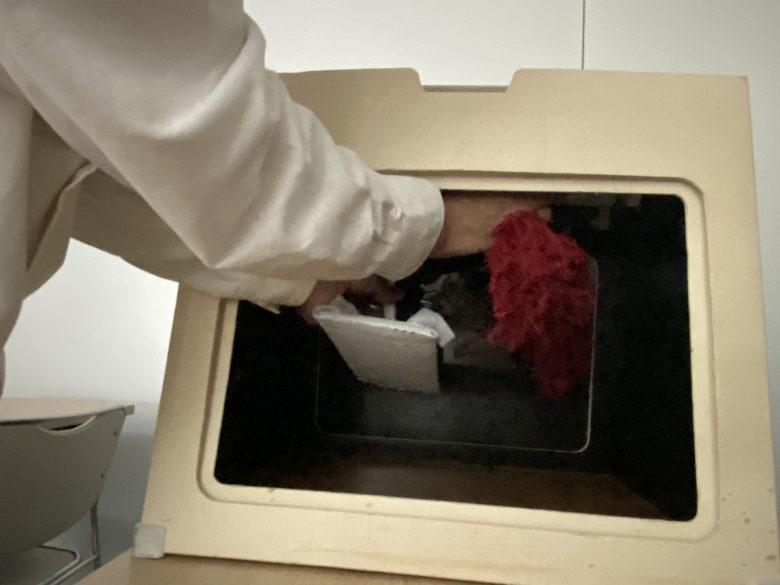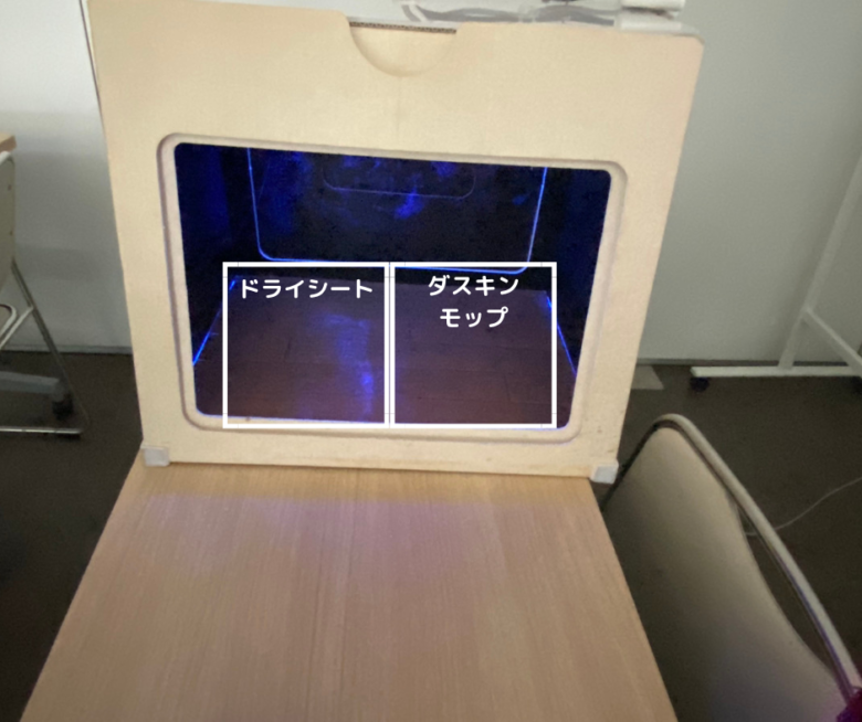 「じゃもう一度この箱の中にシートとモップを高い位置から落としてもらえますか?」