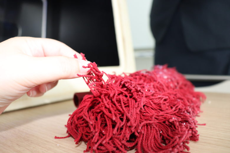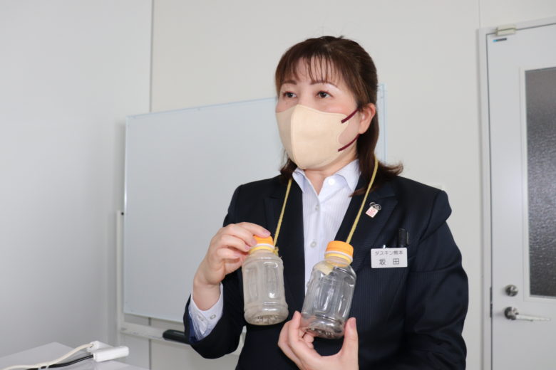 「そっちがダスキンモップでとったホコリですね。互いを吸着させる性質があるので、粉にならずにこういう風になるんですよ。だから高いところからモップを落としてもホコリが舞い上がりにくい。見える装置ができるまでは、このペットボトル入りのホコリを首から下げてお客様に見せてたんですよ」