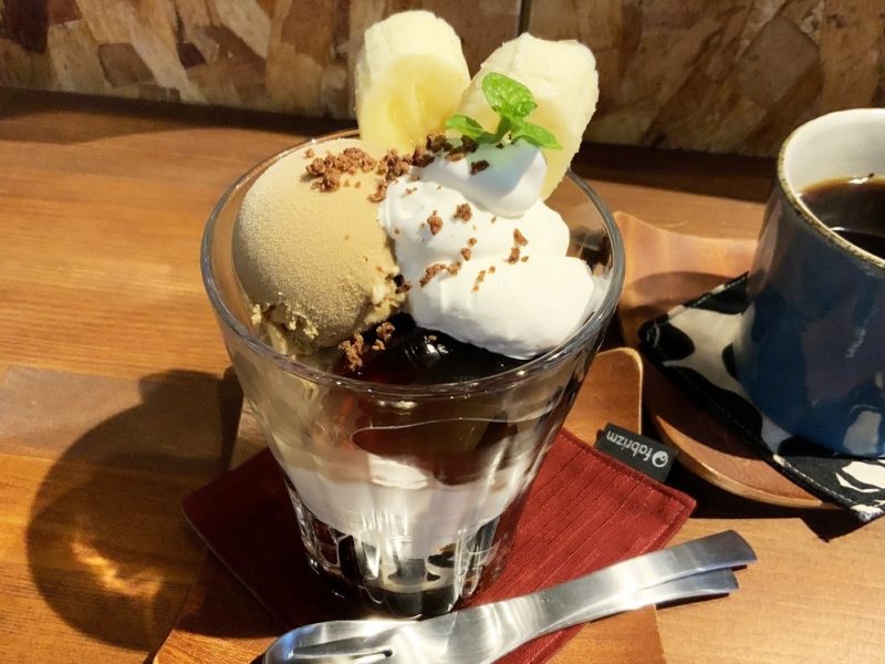 コーヒーゼリーパフェは、水出しコーヒーから作った自家製コーヒーゼリーとクリームが層になり、上にはカプチーノアイスとバナナが乗っています。