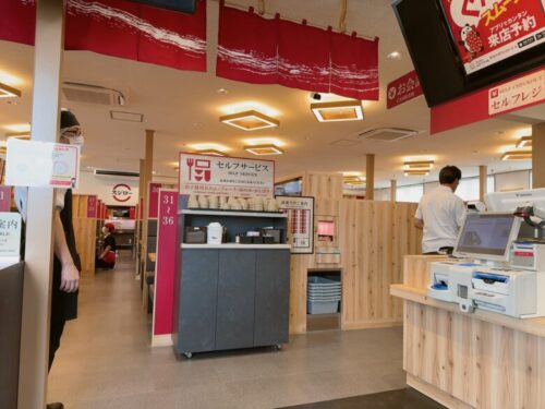 ちなみに、席に湯呑等はありませんのでレジ横のセルフサービスコーナーで必要なものは持ち、席に向かいましょう。