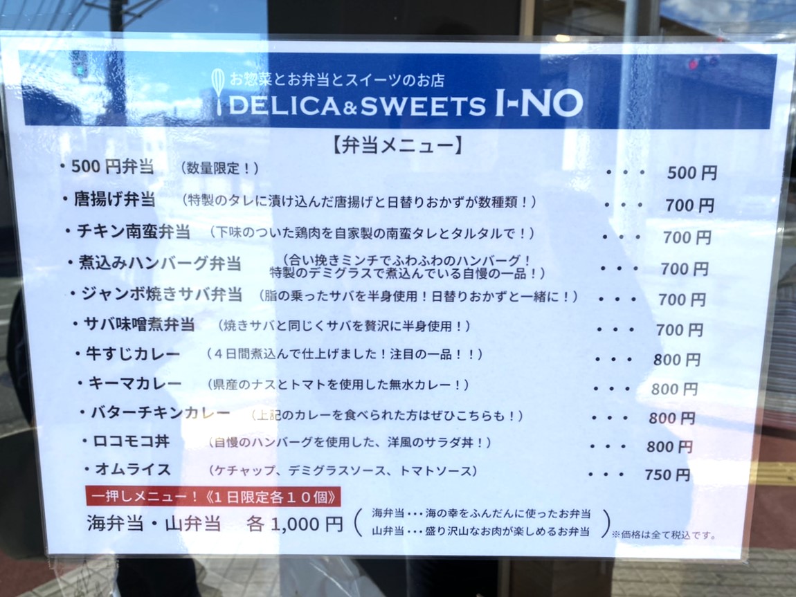 「DELICA & SWEETS I – NO(デリカ&スイーツ イーノ)」というお惣菜・お弁当・スイーツのお店です。2022年10月22日(土)にオープンされました。