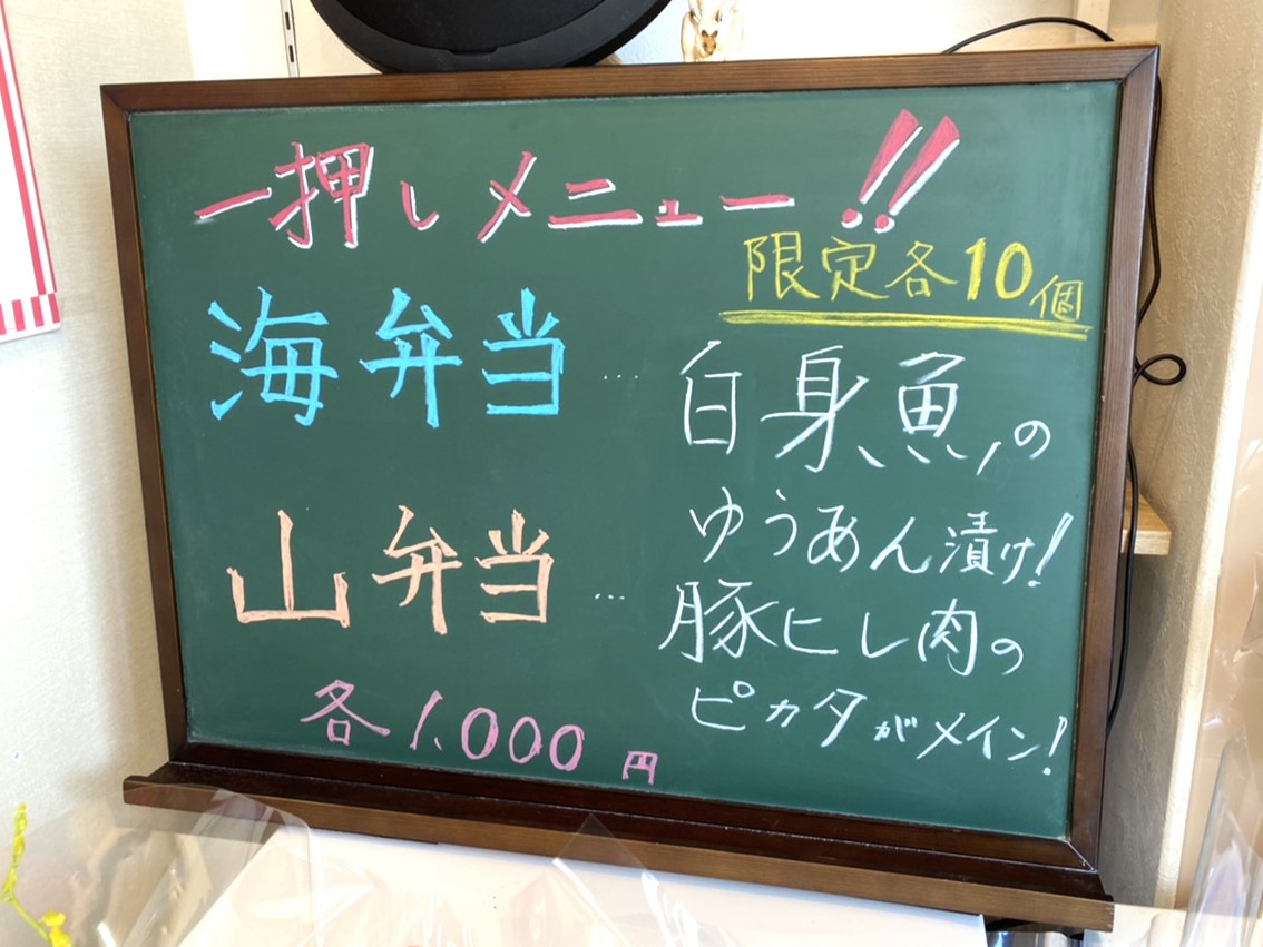 お店の一押しメニューはこちらの海弁当と山弁当。どちらも1日限定10個なんだそうです。