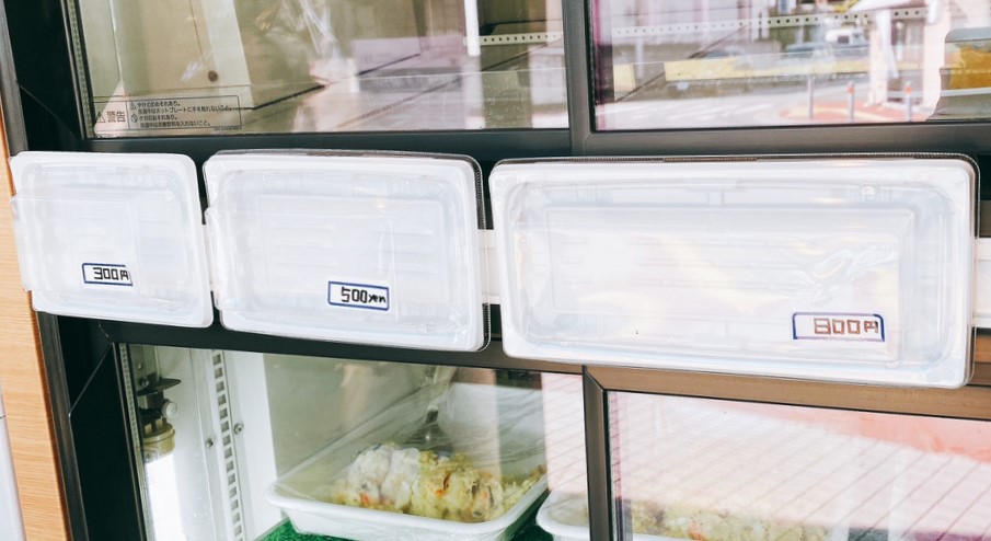 お惣菜の詰め合わせもできるそう。値段表記がないお惣菜は、この大きさの異なるパックを買って入るだけ詰めてくれます。お惣菜のバイキング?重さ売りでもなく斬新なシステムです。
