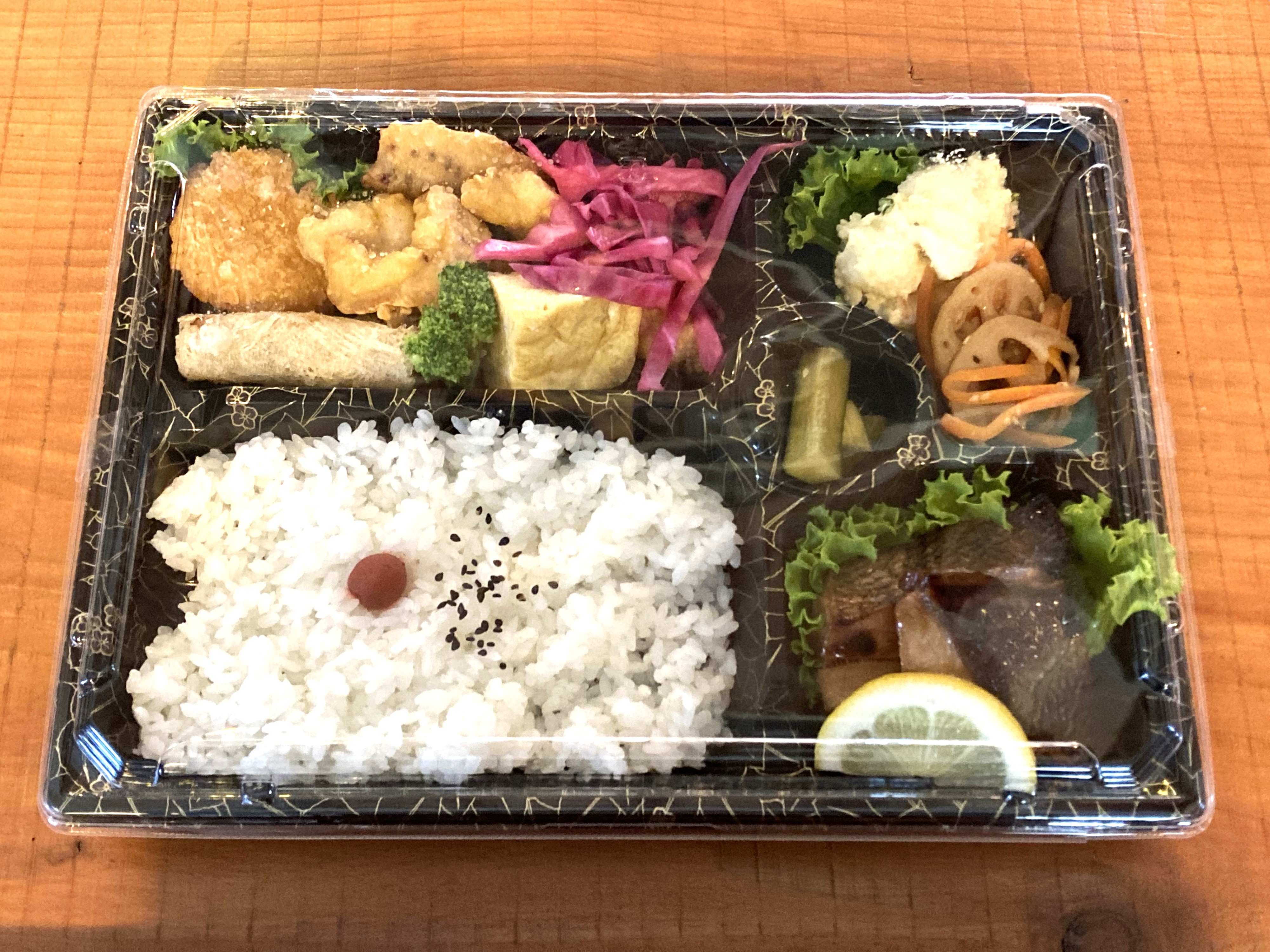 最後はお店の一押しのお弁当。運よく海弁当も山弁当もありました。今回は海弁当。メインの白身魚のゆうあん漬けに加えて、揚げ物3種類、玉子焼き、副菜4種類。贅沢なラインナップです。