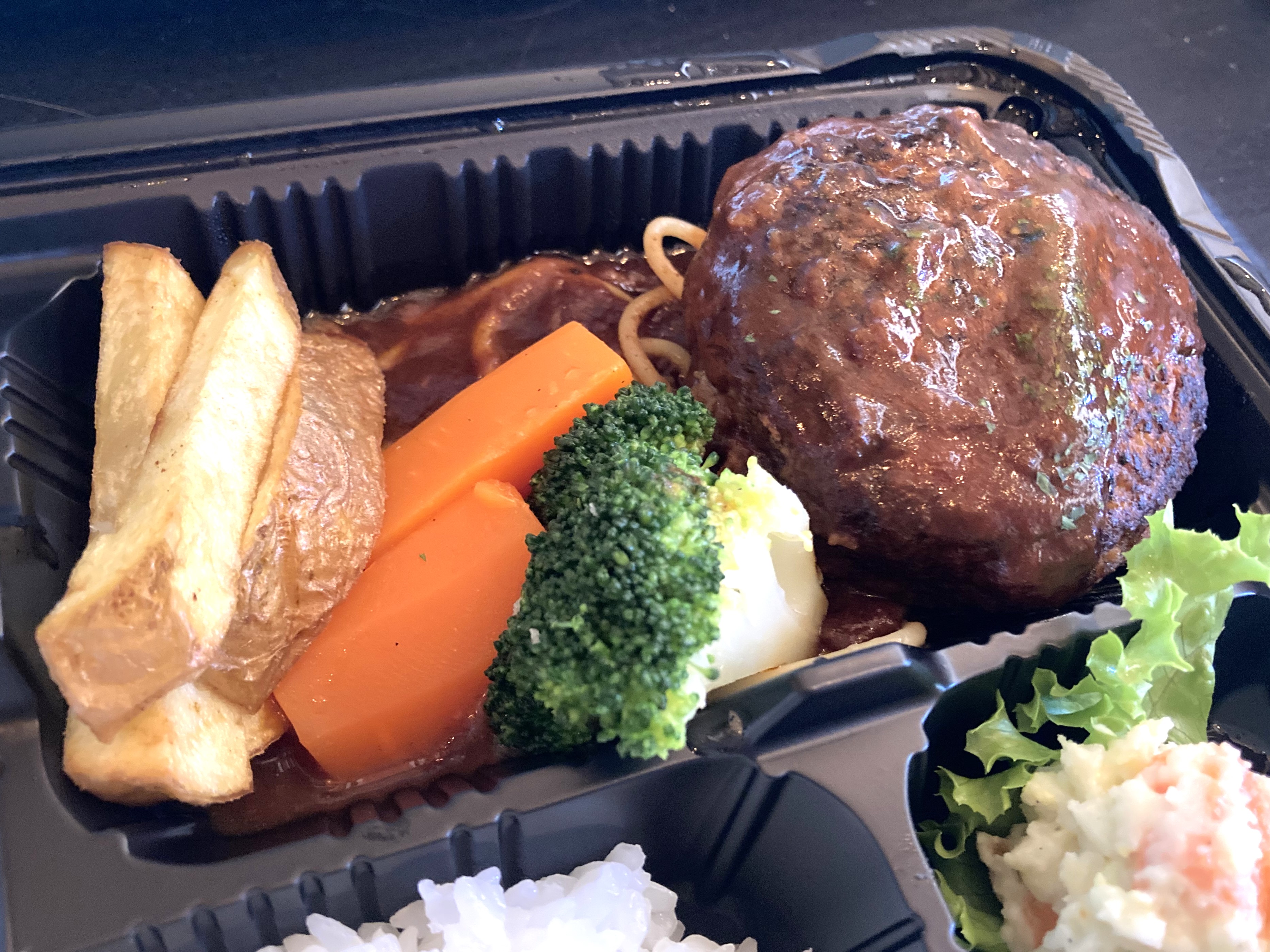 煮込みハンバーグにフライドポテト、にんじんのグラッセにブロッコリー、そして下にはスパゲッティ。まるでレストランの一皿。彩りもキレイですねー。