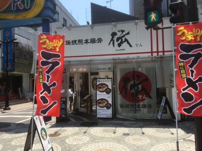 中央区花畑町、銀座通りと栄通りの交差点角にあります、「伝統熊本豚骨 伝」