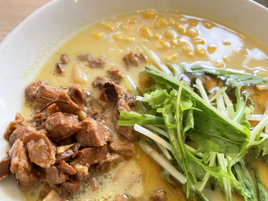 スパイスに負けない味付けのチャーシューが、カレーラーメンになるのを踏みとどませてる感もあります。コーンが入ってると、白味噌ラーメンにも見えますね。