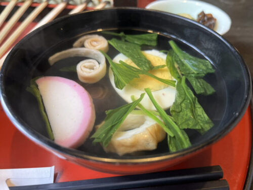 お吸い物はかつお節と昆布のダシが効いていて上品な味が口に広がります。小鉢は素材の味が活かされています。