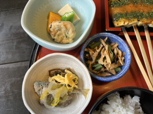 メインメニューの田楽と小鉢3品、漬物、ご飯、お吸い物がついた豪華な定食。(小鉢の内容は随時変わるそうです)
