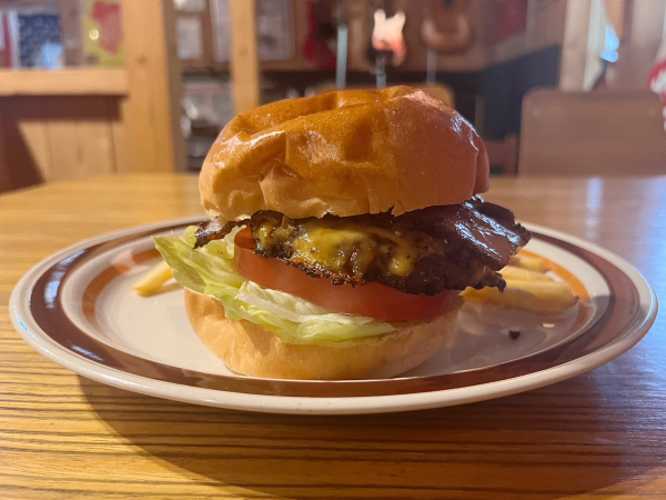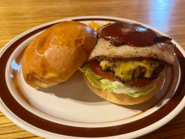 ふかふかのバンズには、赤牛100%パティ・自家製ベーコン・トマト・レタス・チェダーチーズが挟まれていてとってもボリューミー!