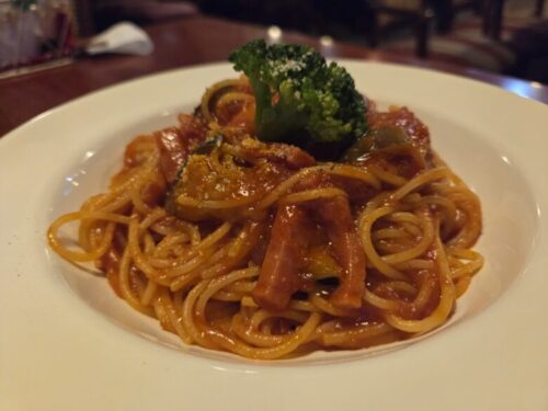 こちらはパスタ。茄子とベーコンのアラビアータです。