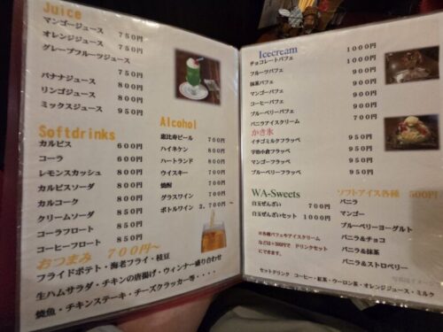 ウイスキーを始めとしたアルコール類、カルピスや各種フルーツのジュースなどソフトドリンクもあります。