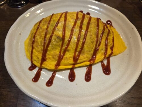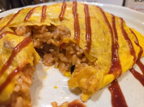中身はチキンライス。鶏肉や玉ねぎ、パプリカが入っており、彩りも良い。ケチャップを纏った甘い玉子がチキンライスを包み、ほんのりとした酸味としっかりとした旨味が口の中を満たします。