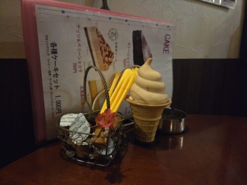 テーブルにはミニかごに入れられたシュガーやコーヒーフレッシュ、そしてミニチュアソフトクリーム。かわいい。