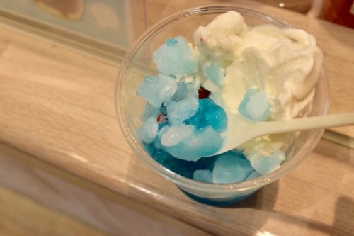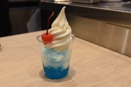 夏らしい鮮やかなブルーのゼリーと氷!そしてソフトクリームがドンと乗ったその名も「パチパチフロート」! パチパチ…?と思いながらスプーンですくって味わってみると…