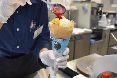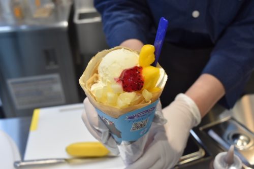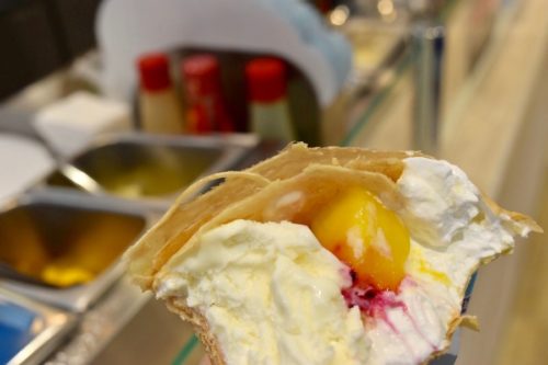ディッパーダンといえば、県産の米粉を使った焼き立てクレープ! 店長おすすめ、期間限定の「アイスマンゴーパイン」を注文しました。
