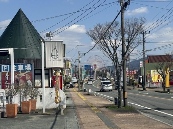 お店の駐車場から観覧車が見えます。目の前にはジョイフルもありますよ。