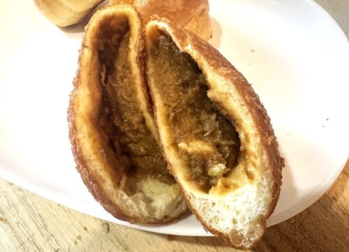 カレーパンの中身はパンが薄く、具がぎっしりで肉や野菜がゴロゴロ入っています。