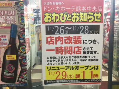 また「熊本中央店」は11月29日(木)にリニューアルし、店名を「ドン・キホーテ熊本西銀座通り店」に変更となるそうです。