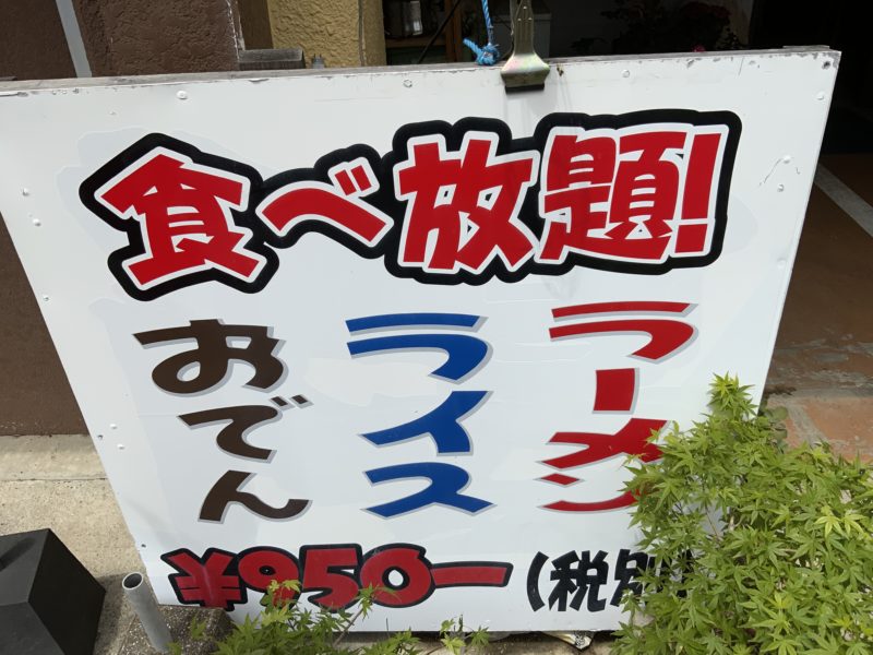 なんと、このお店、ラーメン、ライス、おでんが食べ放題。この看板は昔の金額で今は税込1000円ぽっきりです。