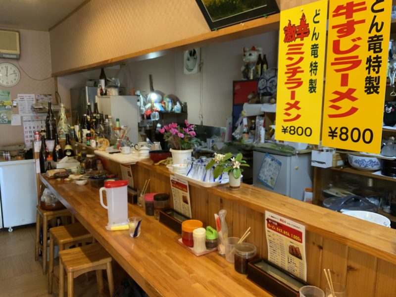 ラーメン、ライス、おでんが食べ放題で1000円という破格のラーメン屋「どん竜ラーメン」。創業47年。3年半前にこの場所に移転したそう。