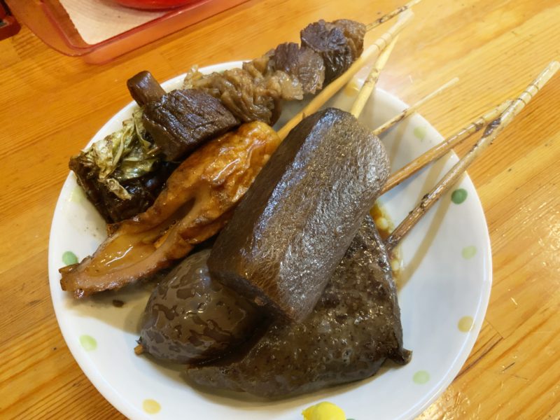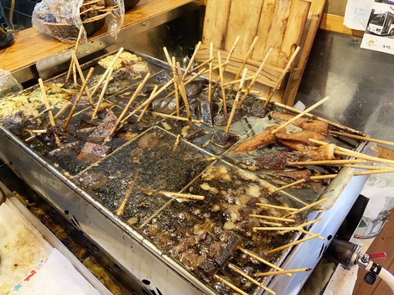 おでん鍋を見てびっくり。すっごい黒い。めっちゃ古いんじゃないか?と不安になりますが、常に火にかけ続け染み込ませる静岡おでんで、だいたい1日~2日のものばかり。すっごく染みてて美味しそう。