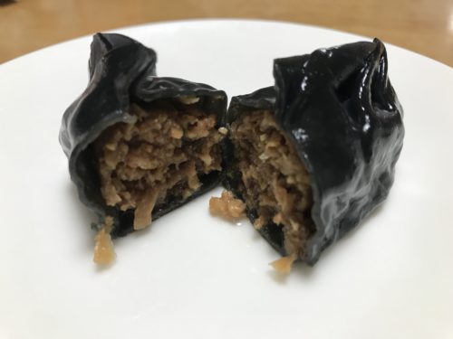 黒は、ほぼお肉のみの餡の餃子。お肉の存在がとても感じられます。お肉の餡ですが重みはなく、食べると肉汁がひたひたと広がっていきます。