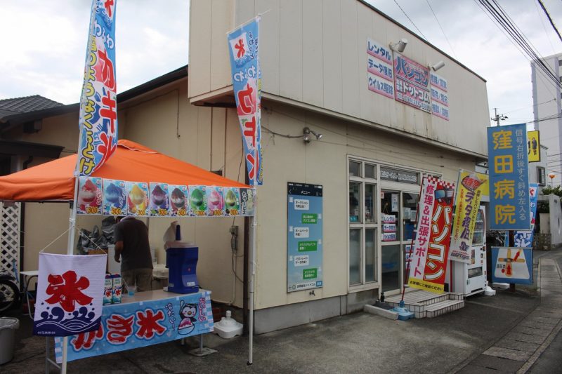 かき氷は火曜、木曜、土曜はおっちゃんが立っているらしいですが、立っていないときも旗さえ出ていれば隣のパソコンレンタル屋さんに言えば作ってくれるそうです。