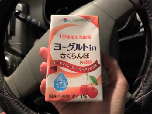 チーズスティック1本と、ジュース5本を買って、車でスタンバイ。新商品という「ヨーグルトinさくらんぼ」もゲットして、わくわくしながら開演時間を待ちます。