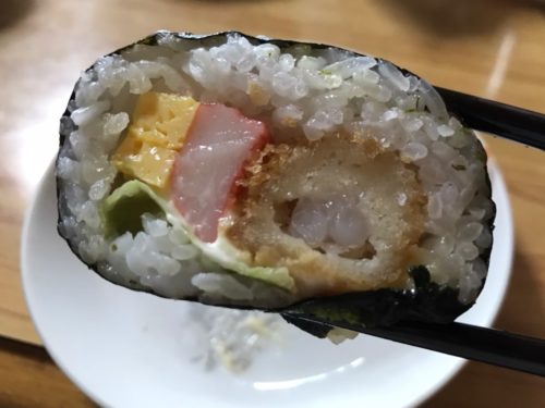 「ぎおん」の「エビフライをサラダ巻き」(税込600円)は、大きなエビフライまで入って贅沢!おいしくて食べ応えがあります。