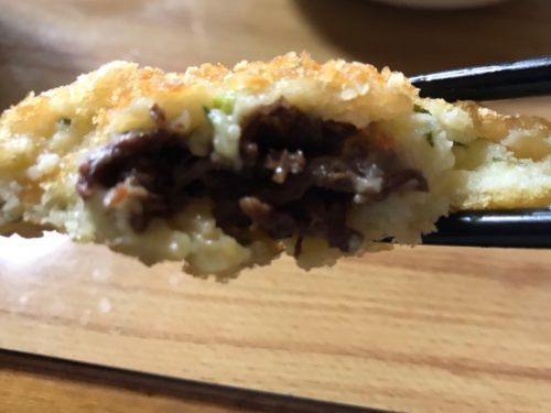 「旬彩処 まつ川」の馬にらコロッケ(3個入り税込400円)は、にらが香るほくほくのじゃがいもの中に、馬肉がぎっしり!
