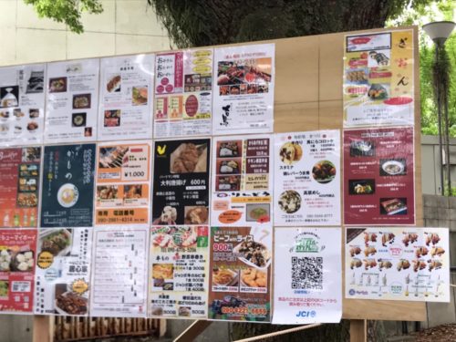 真っすぐ進んでいくと、看板が何ヶ所にも設置されており、今回販売されている飲食店の一覧を見ることができます。