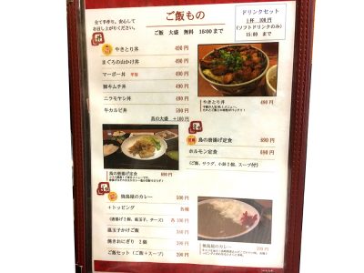 15時までのランチタイムには、ご飯が無料で大盛りにできたり、ドリンクが一杯だけ100円というサービスも。それ以外は昼と夜のメニューに違いがないので、いつ訪れても楽しめます。