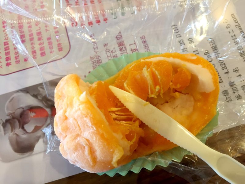 オレンジの可愛い見た目の大福でナイフ付です。中を割ると・・・