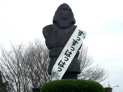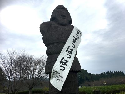 どうやら、今年8月に公園一帯で開催される「古墳祭」に際して、改めて古墳に興味を持ってもらおうと、和水町の観光課職員がこの巨大タスキを石人に掛けるアイデアを提案し実行!