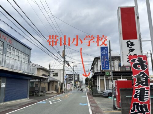 上の写真(分かりにくくてすみません)でわかりますか?「江戸新」の先の右手が帯山小学校です。