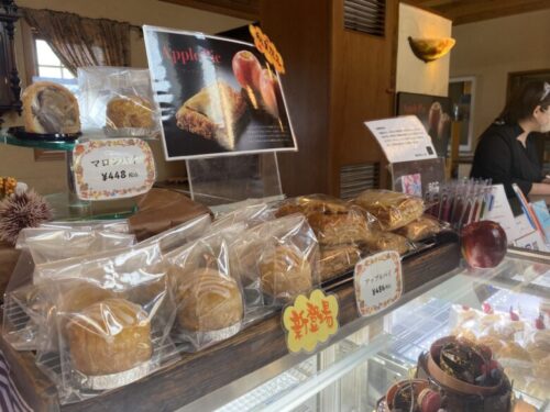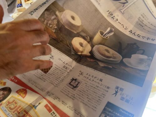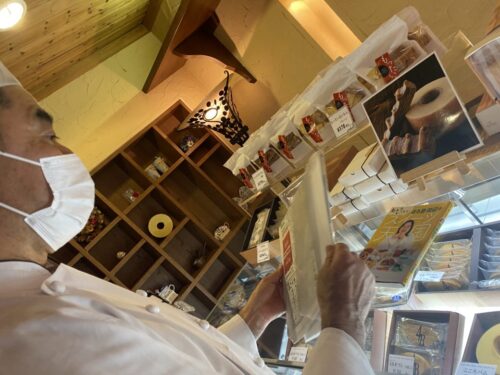 この日は江津店の店長さんがお休みで、支配人の赤池さん(瀬の本高原店勤務時代に1日1,000個のバームクーヘンを売った伝説を持つ)がシェ・タニの人気商品や歴史について楽しくお話してくださいました。