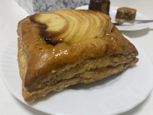 アップルパイといえば煮リンゴが中に入っているものが主流ですが、シェ・タニのアップルパイは東北産の生のリンゴを上に乗せて焼き上げるスタイル。なのでリンゴの生の触感とみずみずしさが残っており、フルーツタルトのような感覚のアップルパイを楽しむことができます。
