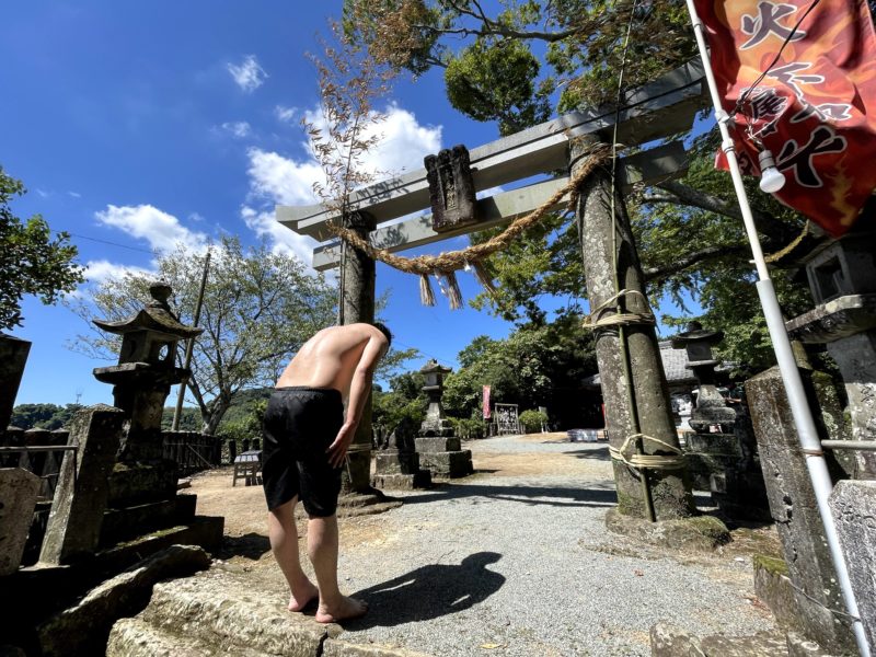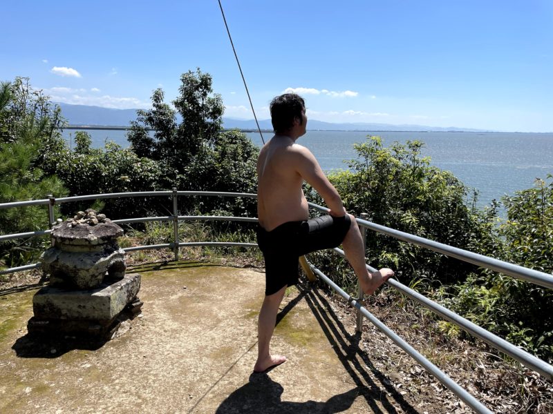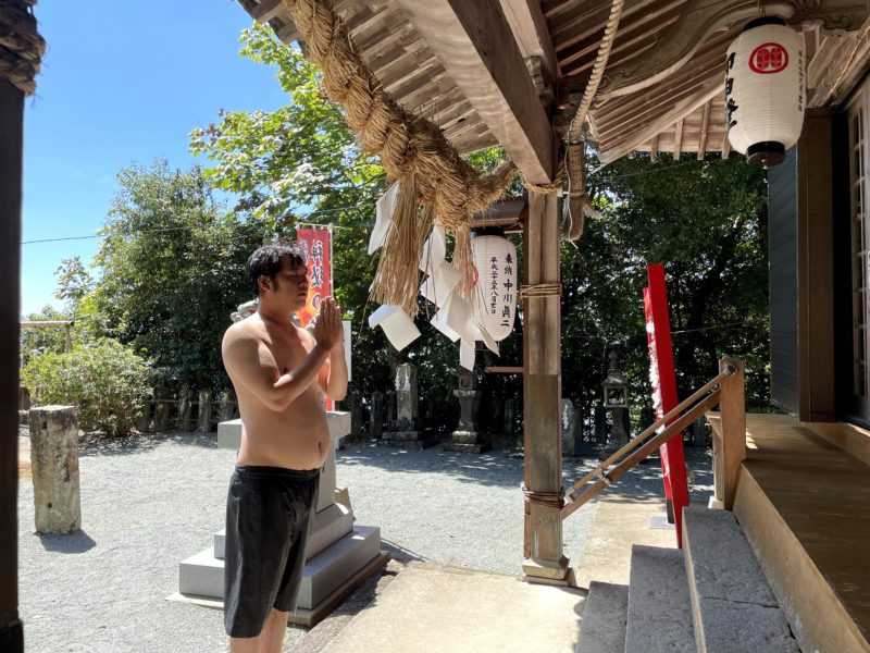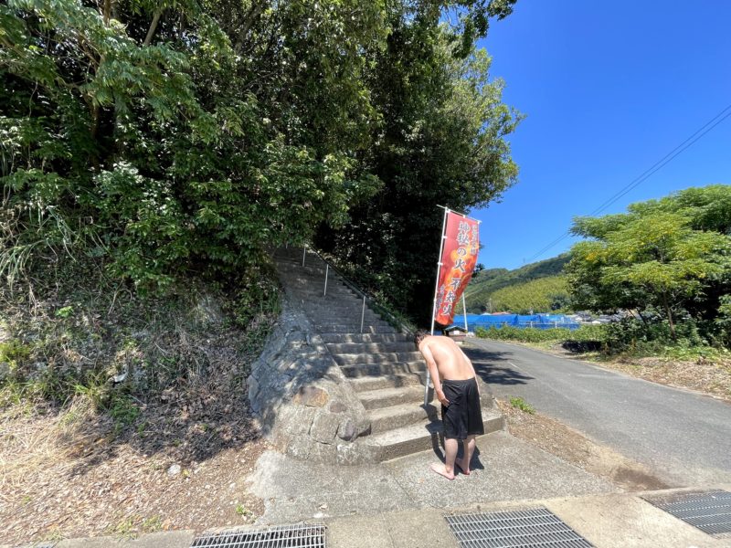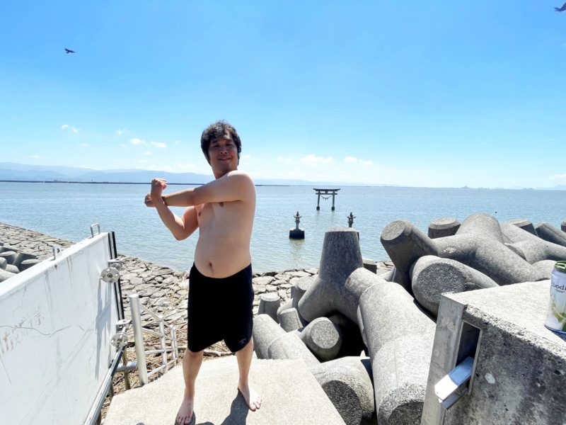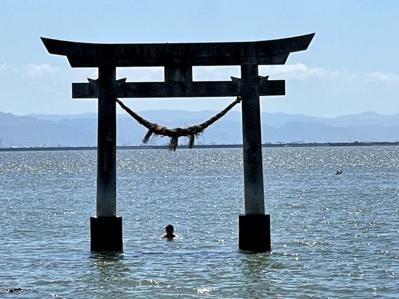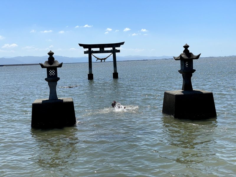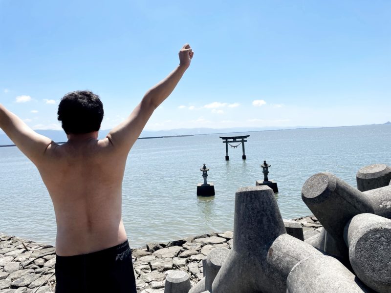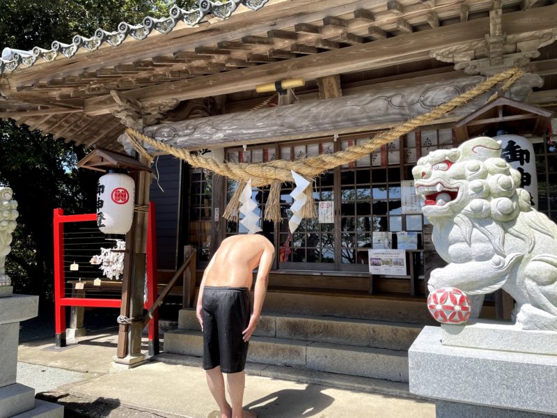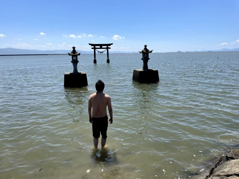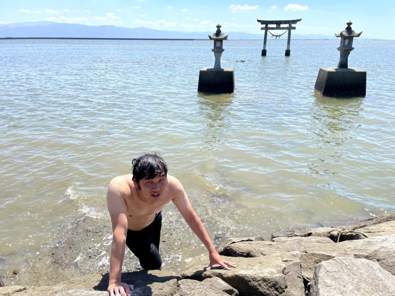 基本的に神社には鳥居から伺って参拝するのが基本です。ということで、まずは鳥居まで行くことにしました。偶然水着持ってて良かったぁ。