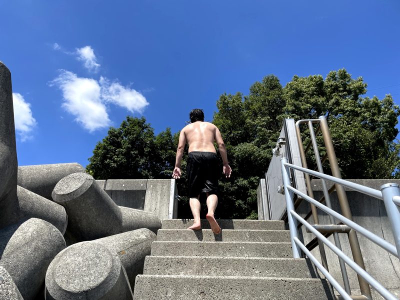 堤防を登って行きます。まだまだ暑い日だったので、素足だとコンクリの熱がたまりません。
