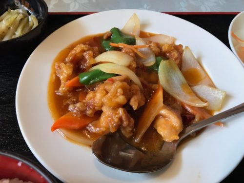 この日の日替わりは、四川風とり炒めで、お肉も野菜もたっぷり!四川風とのことですが、辛くはなく、酢豚のような甘酢あんで、ご飯が進むおいしさです。